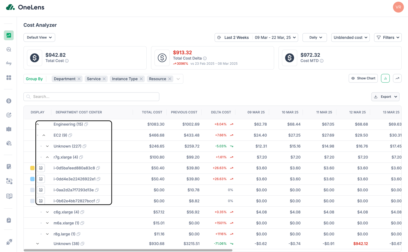 OneLens supports grouping up to **four levels**, enabling multi-dimensional cost analysis for deeper insights.